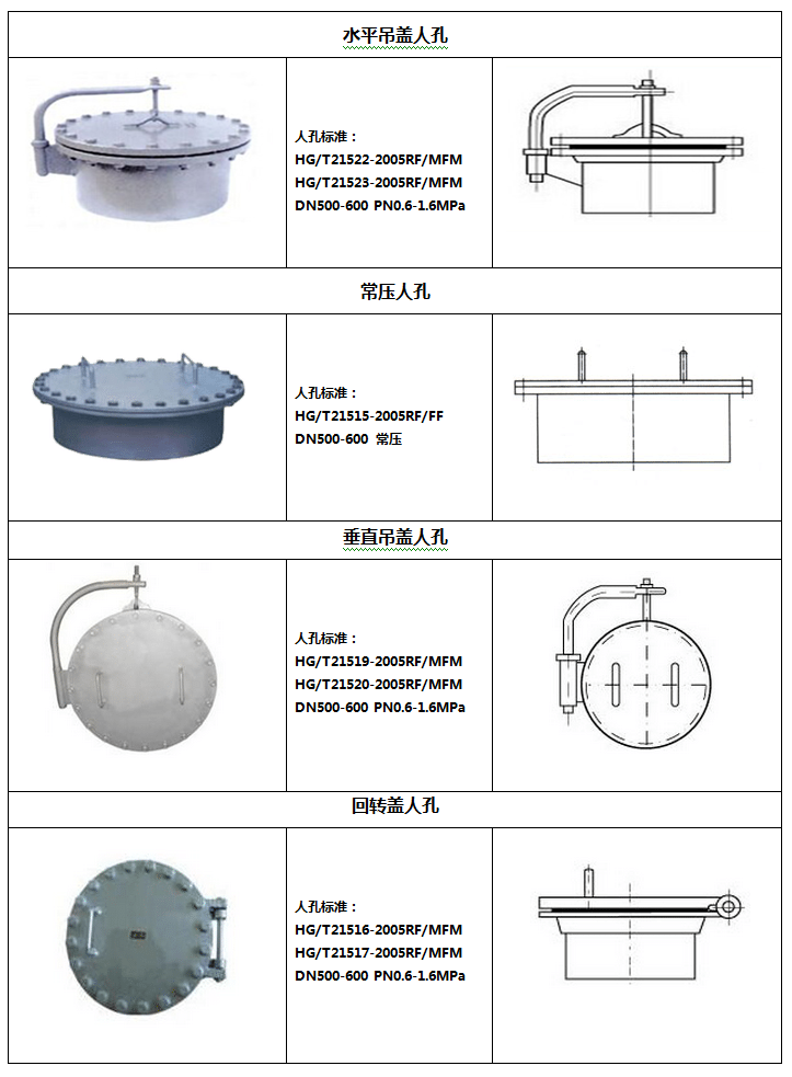 人孔是操作工人在建罐清罐的出入口,也可以利用人孔進(jìn)行通風(fēng),我公司生產(chǎn)的人孔有一下幾種型號,供參考。
