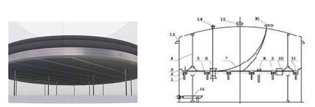 4、如果是鋼制浮頂,通常有多個(gè)浮艙。任意二個(gè)穿孔進(jìn)入儲(chǔ)液,浮頂保證不下沉和造成其它破壞。