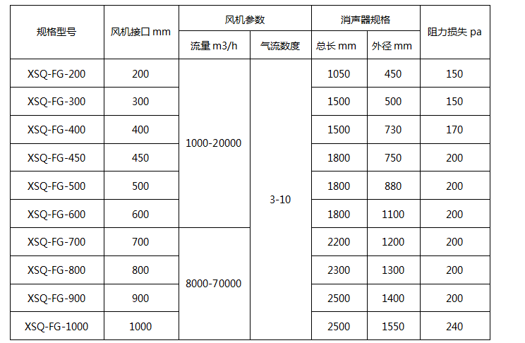 風(fēng)機消聲器分圓形接口和方形接口,本表按圓形接口流量計算,用戶詢價時請報接口尺寸(方還是圓)