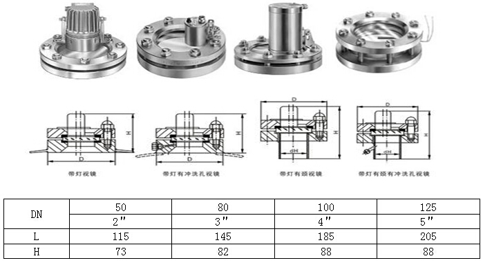 帶燈視鏡是工業(yè)管道裝置上主要附件之一,在石油、化工、醫(yī)藥、食品等工業(yè)生產(chǎn)裝置的管道中,能隨時(shí)觀察管道中液體、氣體、蒸汽等介質(zhì)流動及反應(yīng)情況,起到監(jiān)視生產(chǎn)、避免生產(chǎn)過程中事故發(fā)生的作用.帶燈視鏡一般安裝于壓力容器、真空容器、罐體、反應(yīng)器、過濾器、沸騰床等罐體和密閉容器上,在承受與容器相同壓力、溫度條件下觀察容器內(nèi)部情況,當(dāng)觀察環(huán)境昏暗時(shí),需要配置視鏡射燈,其中分為防爆型和防腐型兩種形式。
